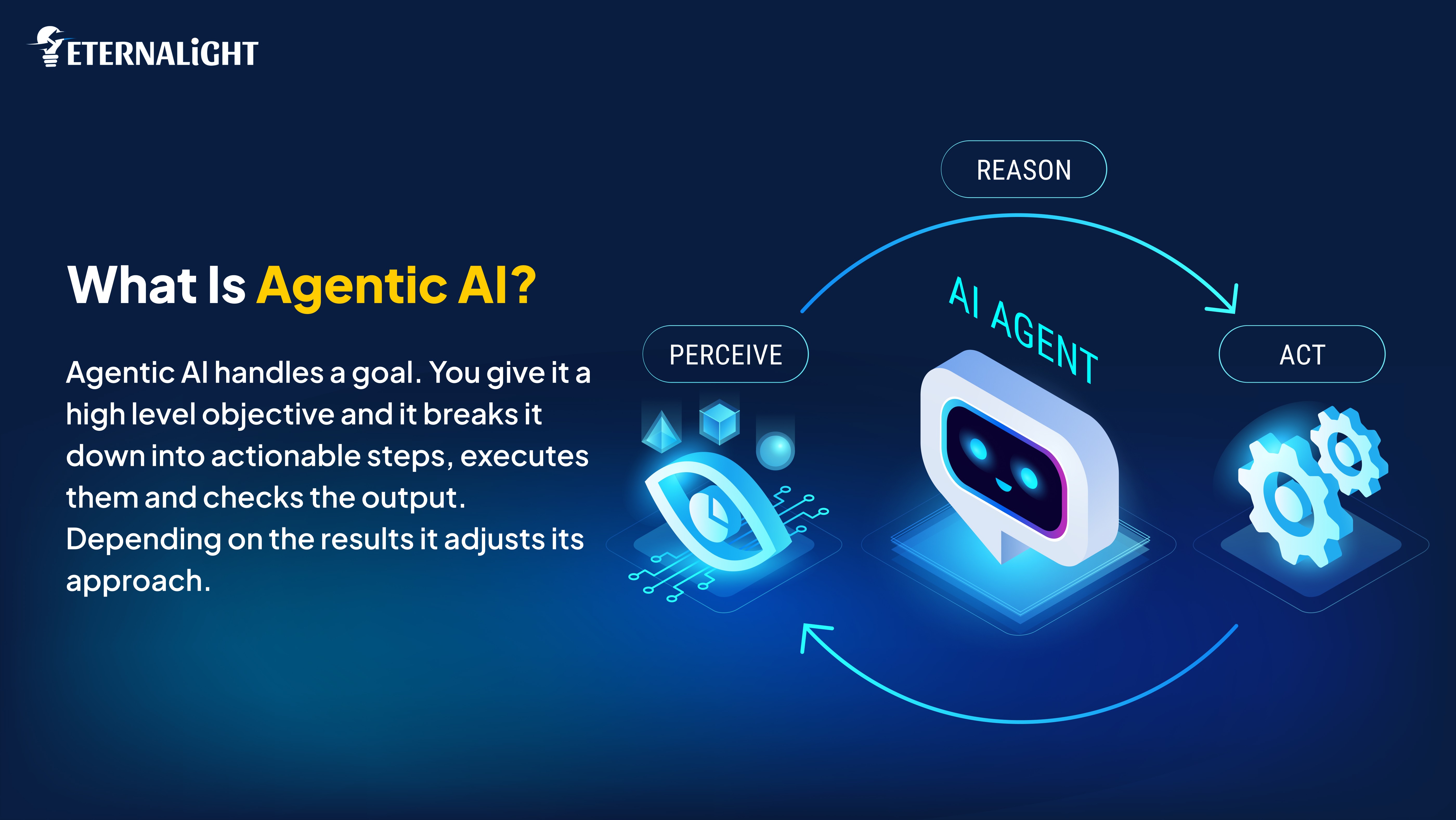 An AI agent handles a task but agentic AI handles a goal. You give it a high level objective and it breaks it down into actionable steps, executes them and checks the output. Depending on the results it adjusts its approach. You are not walking it through the process. It figures the process out on its own. All you need to do is give it a clear objective, a goal.